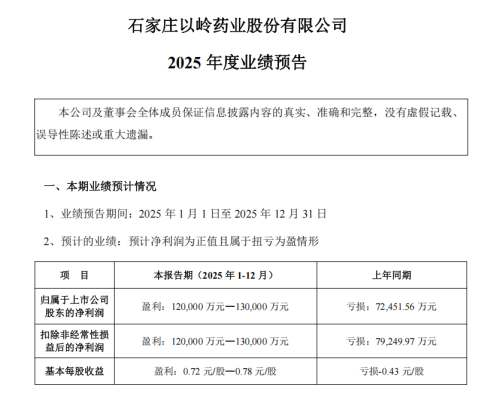 以岭药业发布业绩预告衡牛所,预计2025年归母净利润为12亿元~13亿元,同比扭亏为盈。