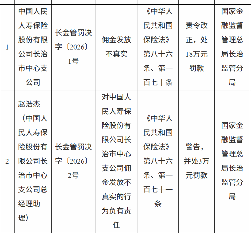 1月30日,国家金融监督管理总局长治监管分局行政处罚信息公开表显示,中国人民人寿保险股份有限公司长治市中心支公司因佣金发放不真实被责令改正并处18万元罚款。责任人赵某杰被警告,并处3万元罚款。